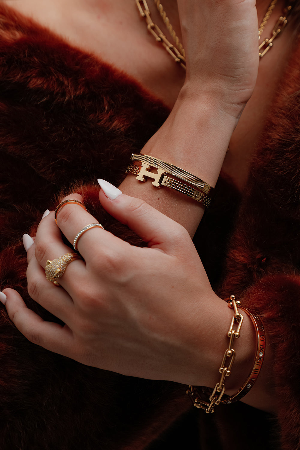 "The Hue Bracelet is a beautiful addition to any jewelry collection. This delicate piece features a sleek gold design, ideal for layering or wearing on its own. Whether you're looking for a standout accessory for a special occasion or an everyday essential, the Hue Bracelet fits perfectly. Visit our online shop or stop by a gold jewelry store near you to experience the beauty of this piece firsthand."
