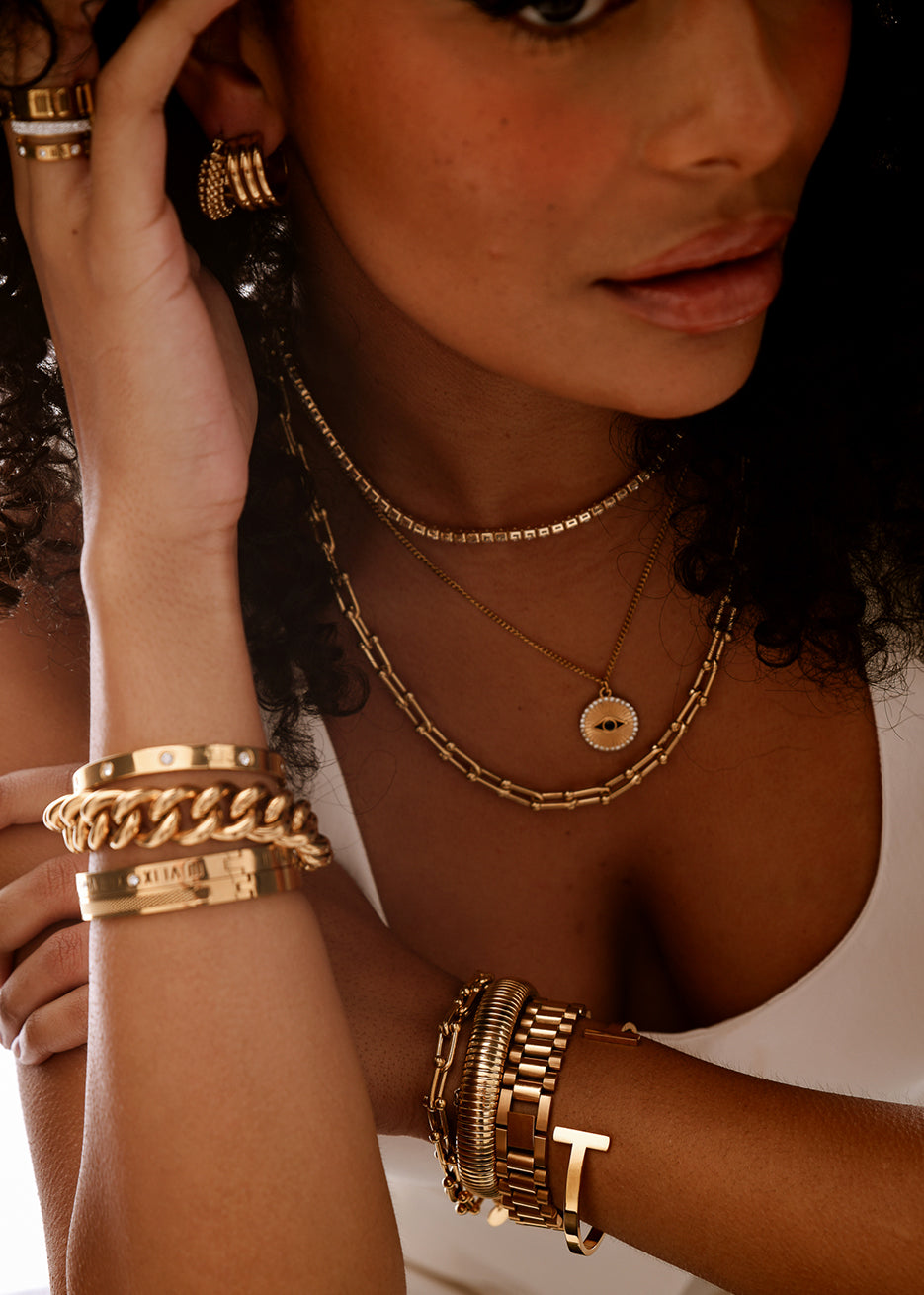 Elevate your look with the Vogue Bracelet, a statement piece designed to showcase modern elegance. Crafted from premium 18K Gold Plated Stainless Steel, this bracelet features a sleek, bold design that adds a touch of sophistication to any outfit.