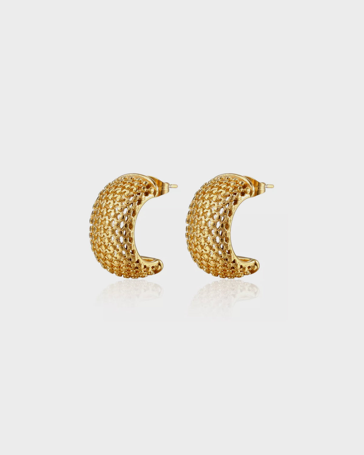 The Curve Earrings redefine modern texture. Designed with a softly domed silhouette and intricate honeycomb surface, they bring dimension and radiance to any look. Crafted in 18k triple-gold-plated stainless steel, these earrings are waterproof, tarnish-resistant, and hypoallergenic — made to last through seasons and style shifts.