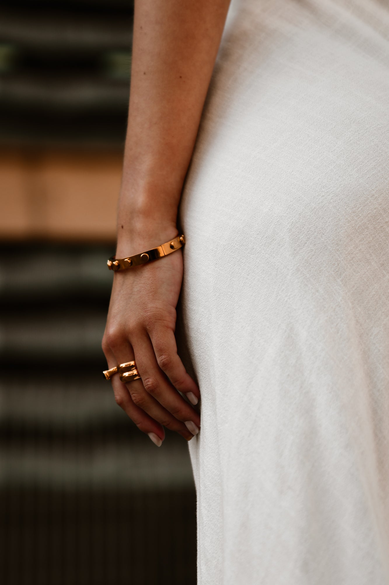 This bracelet is meticulously crafted with 18K gold plating, ensuring a lasting and luxurious finish suitable for daily wear. Its subtle hue and elegant design make it a versatile accessory that complements various outfits and occasions.