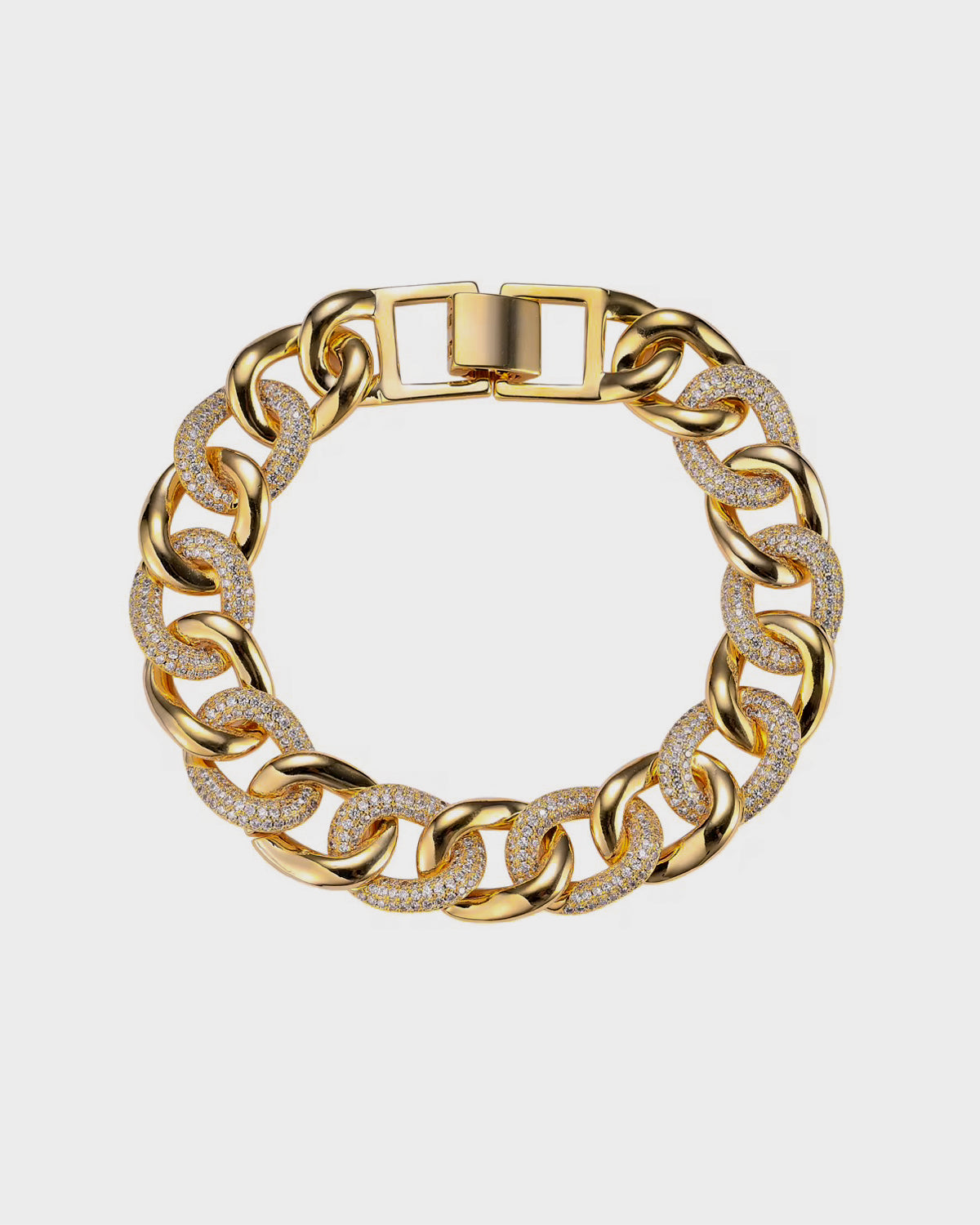 Crafted with a radiant gold-tone finish, this substantial bracelet features a series of bold, interlocked links, each pavé-set with shimmering diamonds that catch and reflect light from every angle. The meticulous detailing and exquisite craftsmanship showcase the brilliance of the diamonds, creating a dazzling display of luxury.