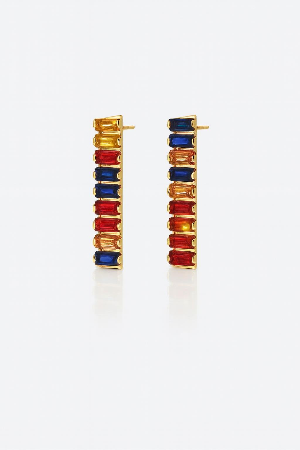Crafted in gold-finished stainless steel, each earring features a seamless gradient of sapphire blue, sunset amber and fiery red stones, creating a luminous statement that catches the light from every angle.