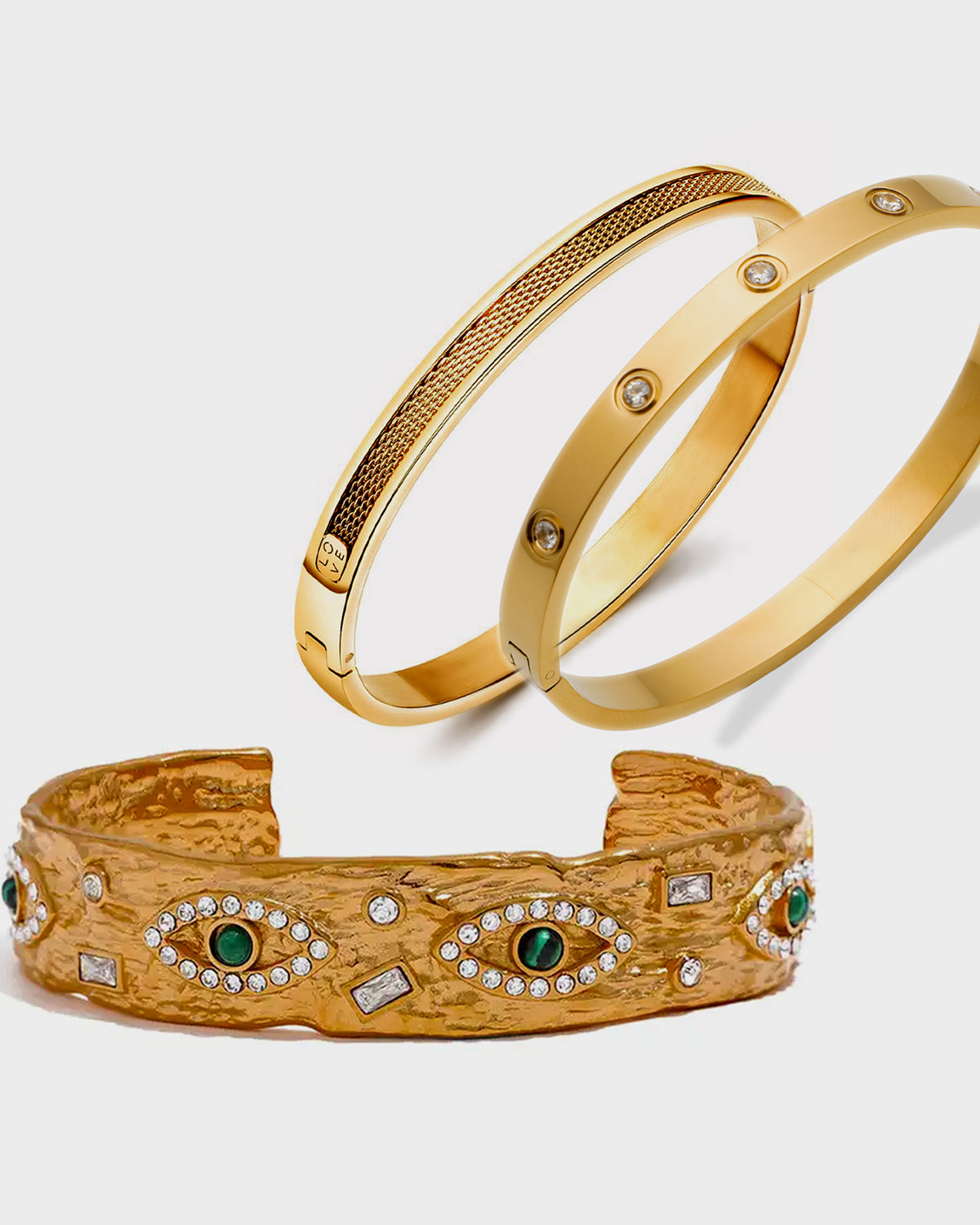 The Eye Layering Set pairs our iconic Eye Bracelet with two of our best-selling classic bangles, creating a powerful everyday stack with meaning. The Eye Bracelet features embedded emerald-green stones framed by sparkling crystal halos — a symbol of intuition, protection, and confidence. Layered alongside our sleek, polished cuffs, this stack brings balance: bold expression, effortless elegance.