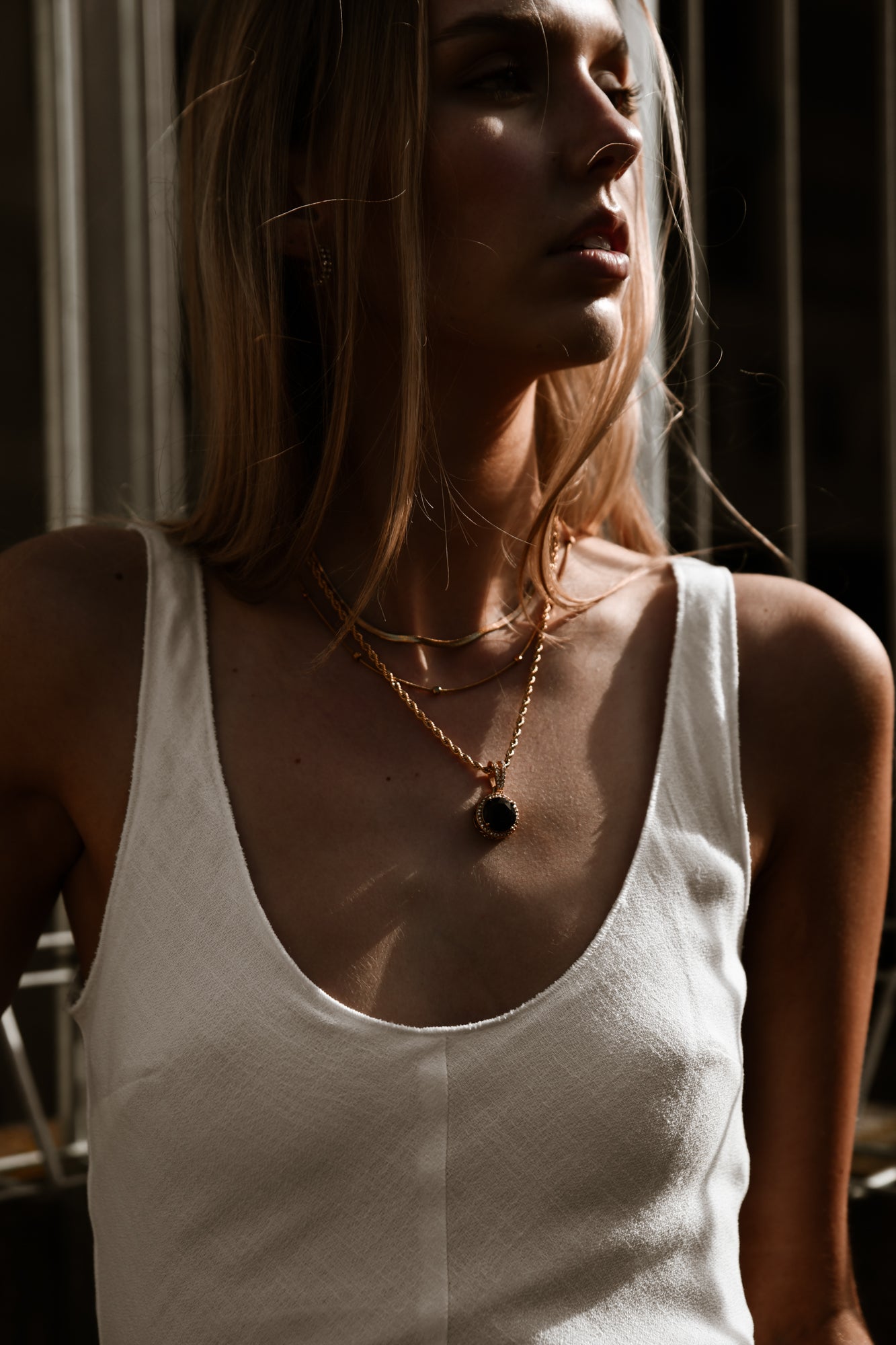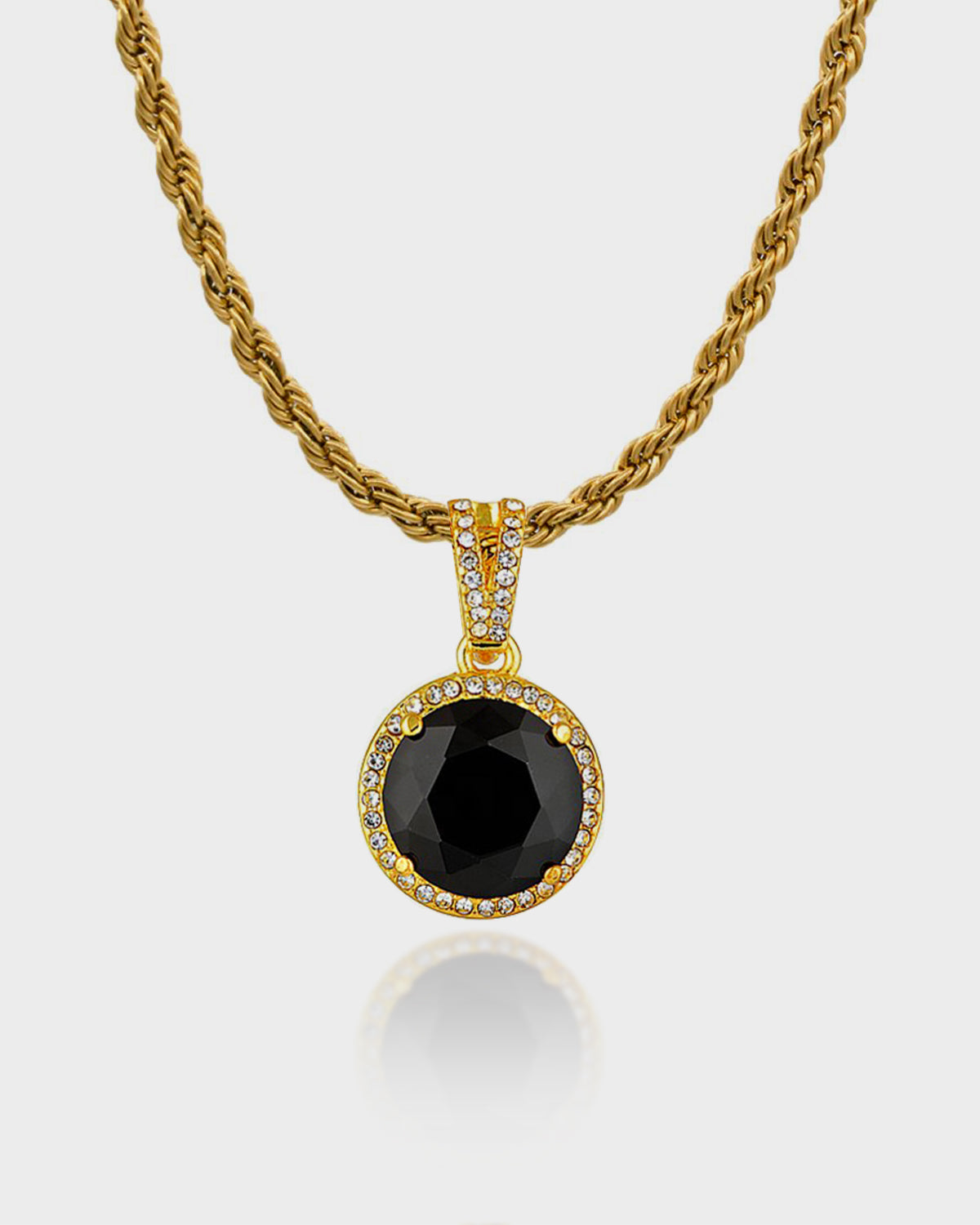 The Stella Necklace is a striking piece that blends luxury with timeless elegance. This pendant features a bold black gemstone encased in a dazzling halo of crystals, hanging gracefully from a twisted gold rope chain. This creates a look that’s both classic and contemporary.