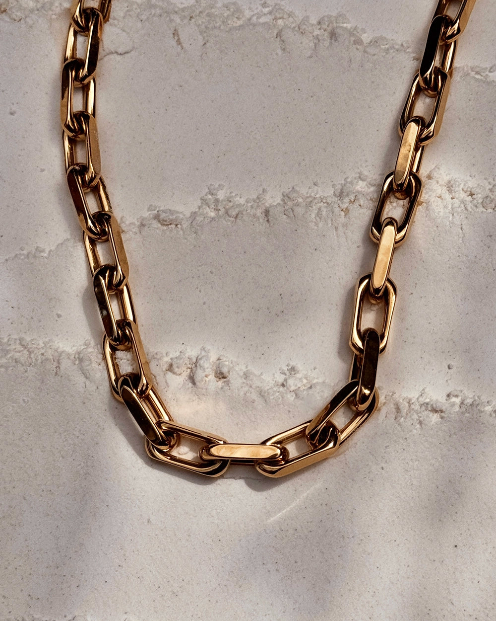 Crafted with large, rectangular links and a polished finish, this necklace is designed to command attention with its modern aesthetic. Its substantial design effortlessly elevates any attire, offering a touch of sophistication whether worn casually or formally.