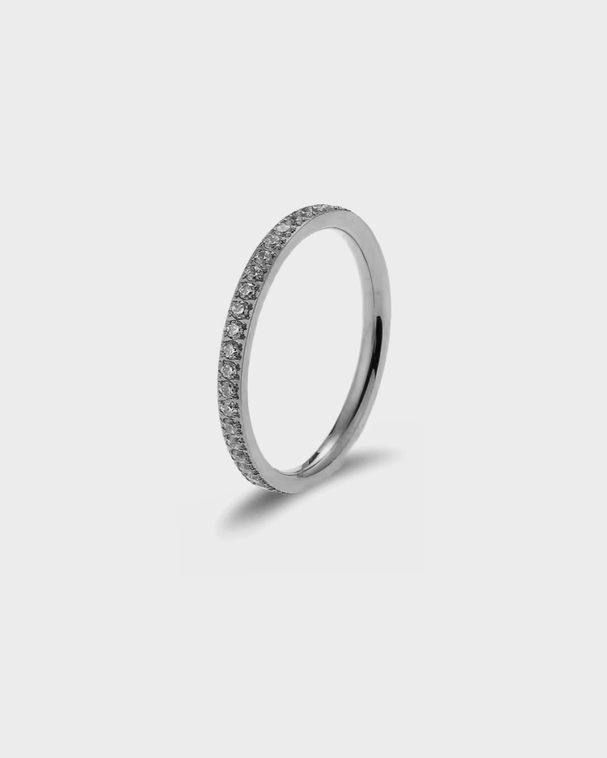 The meticulous setting creates a dazzling yet subtle glow that perfectly complements both everyday outfits and elegant evenings. Its slim and stackable silhouette makes it an ideal choice for layering with other rings or wearing alone for a minimalist statement.