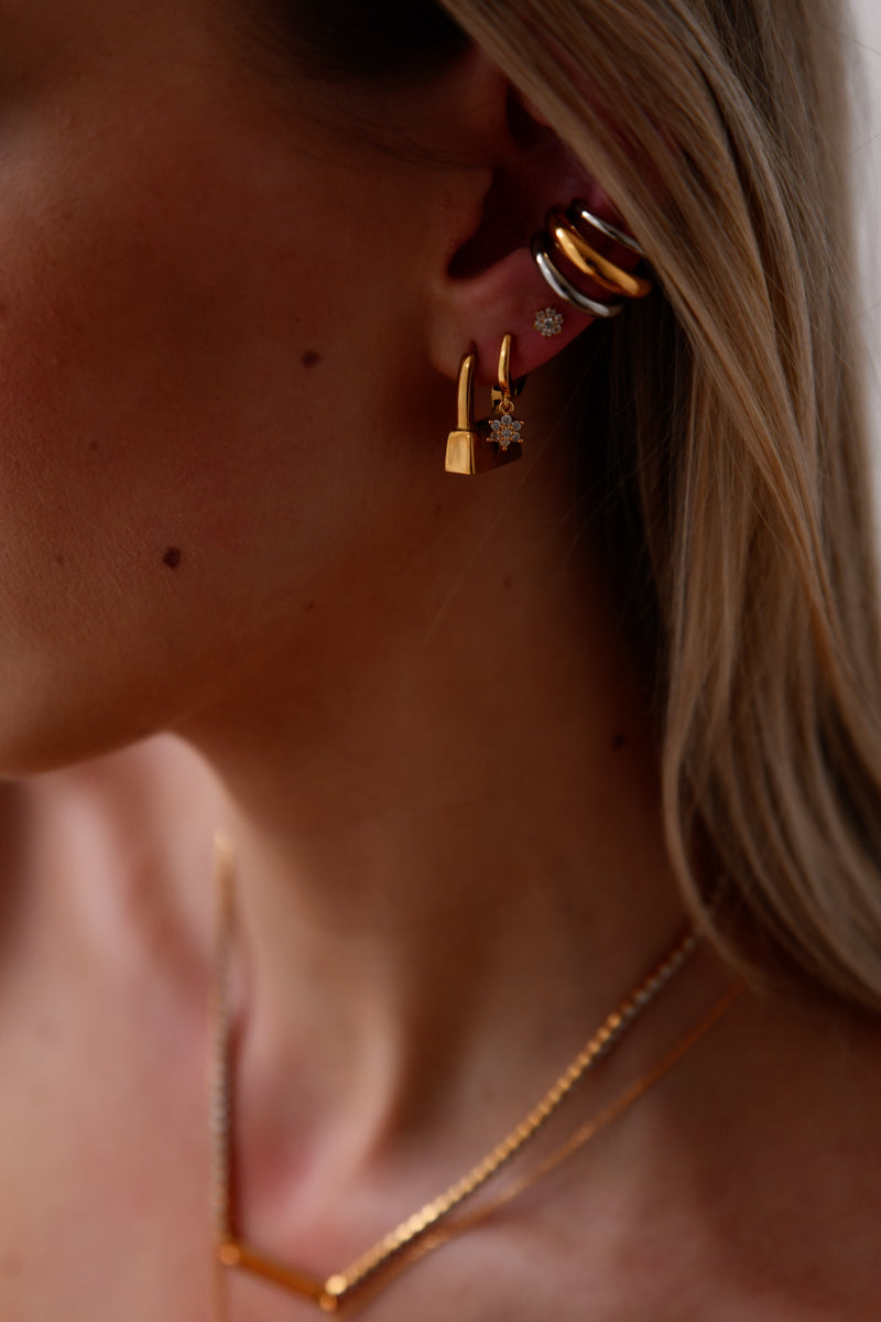 Make a distinctive statement with our Abstract Trio Ear Cuff from Queen & Co. This eye-catching piece features a unique stacked design, comprising three interconnected bands in a captivating two-tone finish—lustrous gold and sleek silver.